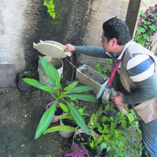 El polvo grisáceo del brigadista Alan Rodríguez es el larvicida que coloca en aljibes, tinacos, macetas, floreros y cualquier vasija con agua, para evitar que se reproduzca el mosco Aedes aegypti, transmisor del virus del dengue. Daniel Bobadilla Hernández mata zancudos dentro de las casas y patios con insecticida que sale de su motomochila.