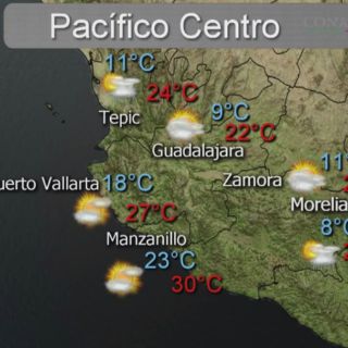 Para el Pacífico Centro se espera clima despejado a medio nublado, potencial de precipitaciones fuertes de 40 por ciento en Jalisco, de menor intensidad en el resto de la región, temperaturas frescas a frías en sierras por la mañana y noche, calurosas durante el día y viento de oeste y noroeste de 20 a 35 kilómetros por hora.