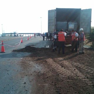 Supuestamente, el chofer del carguero mencionó que otro tráiler lo alcanzó a golpear por lo que uno de los contenedores que trae en su interior se rompió y originó el derrame de la sustancia.