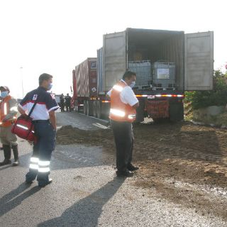 Supuestamente, el chofer del carguero, el cual no proporcionó su nombre, mencionó que otro tráiler lo alcanzó a golpear, por lo que uno de los contenedores que trae en su interior se rompió y originó el derrame de la sustancia.