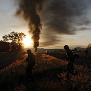 Al mediodía, la columna de humo es menor, pero el fuego sigue presente. Los chorros de agua en mangueras tienen como propósito evitar que éste "brinque" a la vegetación aledaña a la carretera.