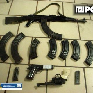 Además, el documento se manifestó sobre el aseguramiento de un automóvil Lincoln Town Car, color arena, con placas 4YVC-110, del Estado de California, Estado Unidos, y que en el interior de éste los policías de la PGJE, localizaron un arma de fuego 38 súper, con tres cargadores, un chaleco antibalas y un fusil de asalto AK-47, mejor conocido como “cuerno de chivo”, con tres cargadores abastecidos, además de 26 balas.