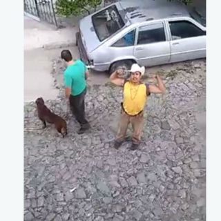 En el video se aprecia a un sujeto de camisa amarilla y sombrero, confrontar al autor del video por estar grabando los hechos, mientras ésto sucede, en un extremo se observa como en segundo hombre comienza a patear al can mientras otro perro comienza a morderlo.
