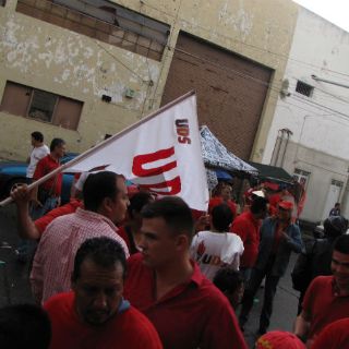 Hacia las 17 horas, sindicalizados vestidos de rojo apoyaban al doctor Oscar Nicolás García Lomelí, candidato por el puesto descrito, a quien se le negó el registro con el argumento de que distintas irregularidades en su labor dentro del sindicato le impedían participar.