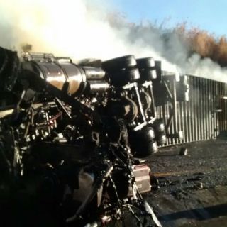 El vehículo, cargado con jitomates y limones, impactó contra un muro de contención, esto ocasionó que el tráiler volcara y posteriormente se incendió.