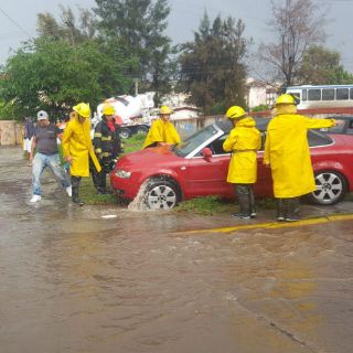 En Tonalá, elementos de la Unidad de protección Civil y Bomberos del municipio auxilian a algunos vehículos que quedaron detenidos en el cruce de las avenidas Patria y Santa Rosalía, donde el agua llegaba a la altura de los neumáticos de los automóviles.