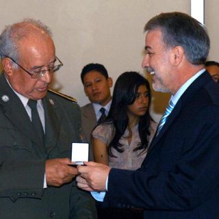 GUADALAJARA, JALISCO (08/JUL/2011).- Ayer, Emilio González Márquez entregó la medalla “Gobernador” al titular de la Unidad de Protección Civil del Estado, J. Trinidad López Rivas, a quien el mandatario estatal considera uno de los personajes importantes de Jalisco, por sus 50 años de trabajo.