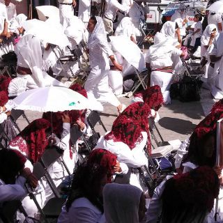 Entre las cascadas de personas vestidas de blanco que hacen los más de 300 mil asistentes hay fieles de 44 países diferentes. Se acomodan adentro y en calles aledañas del recinto ceremonial niños, jóvenes y adultos separados, así como por sexo.