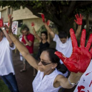 Atendiendo a una convocatoria en redes sociales, unas 20 personas se dieron cita en el fraccionamiento Monraz, donde está ubicado el Consulado, y llevaron a cabo una representación en la que simulaban sangre en sus cuerpos.