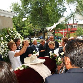 Cerca de las 11:15 horas, los hijos del difunto, su esposa y demás seres queridos se despidieron liberando una paloma blanca entre sus manos mientras el ataúd, que portaba un sombrero charro que aludía a su afición a la charrería, avanzaba sobre una alfombra roja para ingresar a la carroza fúnebre que tomaría las calles rumbo a la iglesia de Nuestra Señora de Bugambilias.
