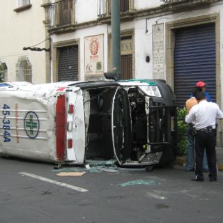 GUADALAJARA, JALISCO (09/MAY/2011).- Una ambulancia de la Cruz Verde Guadalajara, cuando se dirigía atender una emergencia sufrió una volcadura en plena zona Centro de la Perla tapatía.