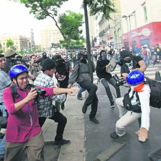Cuando la marcha pasaba por la Avenida Juárez, a la altura de la Alameda Central, los encapuchados iniciaron pintas en edificios. Los fotógrafos se acercaron a registrar los hechos y los manifestantes comenzaron a agredirlos.