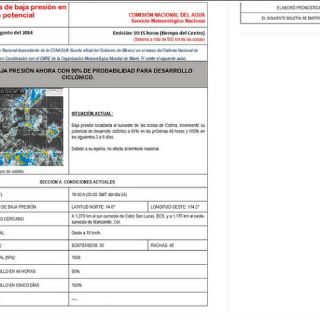 Indicó, en su más reciente reporte, que aunque la baja presión no afecta tierras mexicanas pide a la población tener precaución ante la presencia de lluvias fuertes, chubascos y tormentas eléctricas, además de oleaje elevado en inmediaciones del sistema.