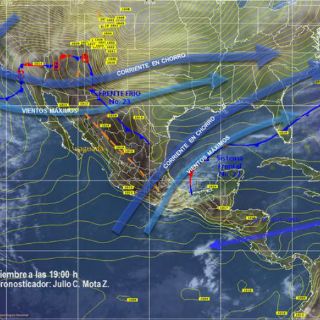 Respecto al frente frío 23, se extiende sobre el norte de Chihuahua y Coahuila y avanza rápidamente hacia el este-sureste, por lo que a su paso ocasionará lluvias fuertes en Coahuila, Nuevo León, Tamaulipas y Veracruz.