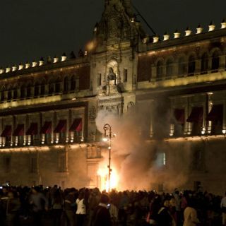 Al concluir la protesta en el Zócalo, a su paso por Palacio Nacional, jóvenes golpearon y pintaron el portón de madera, al cual le prendieron fuego por algunos minutos, sin que hubiera elementos de seguridad que se los impidiera.