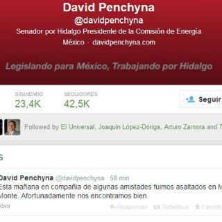 El senador Penchyna en su cuenta de twitter, @davidpenchyna publicó: "Esta mañana en compañía de algunas amistades fuimos asaltados en Mineral del Monte. Afortunadamente nos encontramos bien".