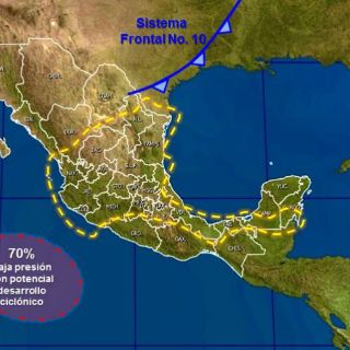 Indicó asimismo que el frente frío número 10 se extiende desde una baja presión en el norte de Oklahoma, Estados Unidos, hasta el norte de Coahuila y Durango, con movimiento hacia el este-sureste.