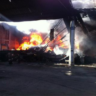 Unidades de bomberos tratan de controlar el incendio de una bodega con unidades de transporte de carga y plásticos