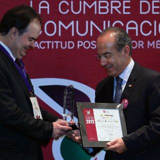 Calderón asistió a la Cumbre de la Comunicación 20-12 en un hotel de la Ciudad de México, cuyo presidente, José Manuel Aguirre Gómez, le entregó un reconocimiento.
