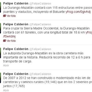 CIUDAD DE MÉXICO (18/OCT/2012).- Después de que Dionisio Pérez Jácome, secretario de Comunicaciones y Transportes, declaró la mañana de este jueves que la carretera Durango-Mazatlán no será terminada en este sexenio, el presidente Felipe Calderón redactó una serie de mensajes en su cuenta de Twitter para resaltar las cualidades de dicha vialidad y lo que hizo en este rubro en su gobierno.