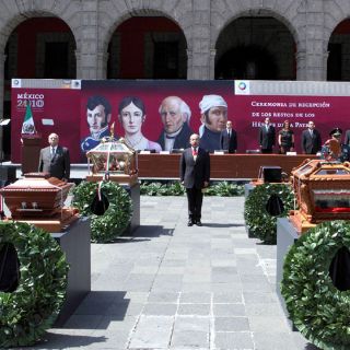 Las urnas con los restos de Miguel Hidalgo, José María Morelos, Juan Aldama, Ignacio Allende, Nicolás Bravo, Vicente Guerrero, Mariano Jiménez, Mariano Matamoros, Guadalupe Victoria, Francisco Javier Mina, Andrés Quintana Roo, Leona Vicario, Pedro Moreno y Víctor Rosales permanecerán en exhibición a partir del 5 de septiembre en la Galería Nacional de Palacio Nacional.