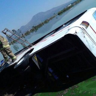 Camión de pasajeros vuelca en laguna de aguas negras en Chalco
