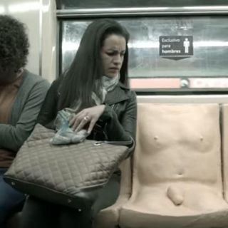 En el primero, llamado "Experimento Asiento", un lugar de un vagón muestra el torso de un hombre y su área genital en relieve, y tiene una etiqueta que lo desgina como "Asiento exclusivo para hombres."