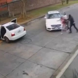 En las imágenes se aprecia el momento en que el auto en el que viajan los supuestos plagiarios le cierra el paso al vehículo de la mujer, a quien amagan y bajan de su Mercedes Benz para subirla a un sedán blanco.