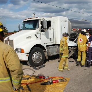 Una pipa que transportaba ácido fosfórico se impacta con un auto compacto en autopista de Occidente
