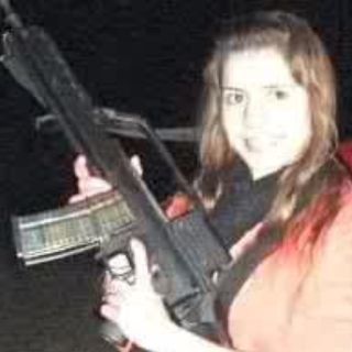 En la imagen, Sarah Fuentes Rascón aparece sonriendo mientras sostiene un fusil de asalto HK, calibre 5.56 x 45 milímetros, similar a los conocidos R-15.