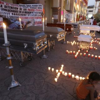 Los manifestantes comenzaron a colocar féretros frente a la alcaldía, en donde también colgaron mantas para denunciar que lo ocurrido el seis de enero pasado fue una ''masacre''.