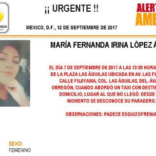 CIUDAD DE MÉXICO (16/SEP/2017).- Una joven de 15 años de edad identificada como María Fernanda fue reportada como desaparecida tras abordar un taxi en la delegación Álvaro Obregón, hace nueve días.