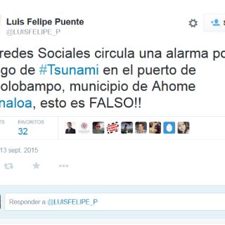 "En redes sociales circula una alarma por riesgo de #Tsunami en el puerto de Topolobampo, municipio de Ahome #Sinaloa, esto es FALSO!!", escribió en la cuenta @LUISFELIPE_P en Twitter.