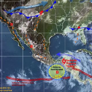 Se desplaza hacia el oeste a 17 kilómetros por hora (km/h) con vientos máximos sostenidos de 65 km/h y rachas de hasta 85 km/h, informó la Comisión Nacional del Agua (Conagua) a través del Servicio Meteorológico Nacional (SMN).