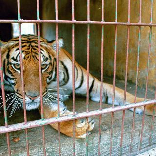 En un espacio abierto del inmueble, los miembros de la milicia localizaron el tigre de aproximadamente dos años de edad, atado a una cadena con una longitud como de tres metros, lo que le permitía al felino tener movimiento en forma controlada.