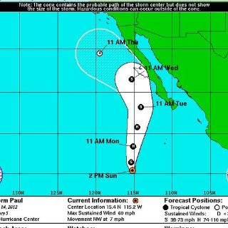 CIUDAD DE MÉXICO (14/OCT/2012).- El Sistema de Alerta Temprana de Ciclones Tropicales del Cenapred emitió la alerta azul para los estados de Colima y Jalisco, así como las islas Clarión y Socorro, ante la presencia de la tormenta tropical 'Paul' en el Pacífico mexicano.