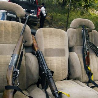 En el lugar se aseguró la camioneta con reporte de robo, tres armas largas AK 47, una AR-15 y un arma corta calibre .38 Súper.