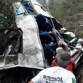 En Motozintla fue rescatado del barranco los restos del camión con placas 074-RM-8, afiliado a la Alianza Mexicana de Organizaciones de Transportistas (Amotac).