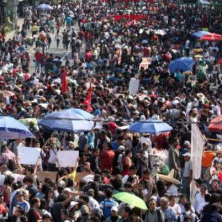 Los manifestantes aseguran que el pueblo michoacano tiene la razón al defenderse contra los narcotraficantes. Con consignas en apoyo a Michoacán esperan salir en los próximos minutos sobre Paseo de la Reforma hacia Bucareli.