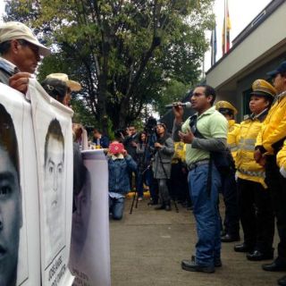 "Tus armas asesinaron a mis hermanos. Vivos los queremos" menciona una de las pancartas que portan los manifestantes.