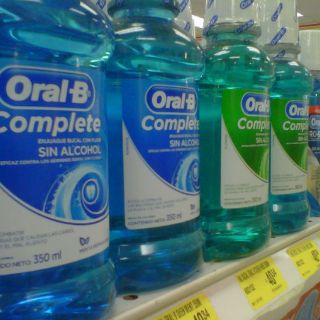 En los mostradores de esta tienda se puede ver el producto a un lado de las demás marcas que también ofertan un enjuague bucal. No hay siquiera un letrero que advierta a los consumidores que la versión hierbabuena y menta de Oral B Complete puede causar infección o irritación debido a los químicos que los componen.