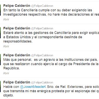 '' @FelipeCalderon: Hablé con @JoseAMeadeK Srio. de Rel. Exteriores, para solicitar que transmita mi más enérgica protesta por el espionaje del que fui objeto.''