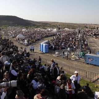 LEÓN, GUANAJUATO (25/MAR/2012).- A una hora de que inicie la misa con el Papa Benedicto XVI en el Parque Bicentenario, cientos de miles de personas se han congregado ya para cumplir con el pronóstico de un arribo de hasta 700 mil creyentes en el evento más importante de la gira papal.