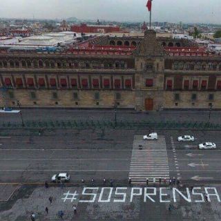 Esta mañana de miércoles un grupo de fotógrafos y periodistas pintaron sobre la plancha de la Constitución "SOS Prensa" y después rodearon el Zócalo con carteles en los que piden justicia para el comunicador michoacano.