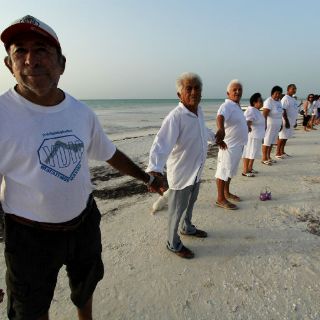 Poco más de 200 personas, en su mayoría vestidas de blanco, se enlazaron físicamente en Playa San Thelmo, en la isla de Holbox, pero también de forma cibernética, con los hashtag #SalvemosHolbox y #YoDefiendoHolbox, a través de twitter.