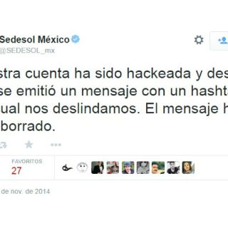 Sedesol) fue “hackeada” y se utilizó para enviar un ''hashtag'' ofensivo, mensaje que fue eliminado luego de que Sedesol recuperara la administración de la cuenta.