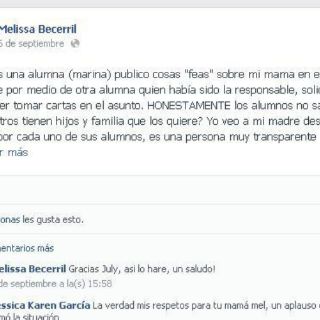 "Hace días una alumna (marina) publico cosas "feas" sobre mi mama en el twitter, al enterarse por medio de otra alumna quien había sido la responsable, solicito apoyo para poder tomar cartas en el asunto. HONESTAMENTE los alumnos no saben que los maestros tienen hijos y familia que los quiere? Yo veo a mi madre desvivirse dia y noche por cada uno de sus alumnos, es una persona muy transparente con ellos...", señaló Melissa Becerril en su muro de FB.