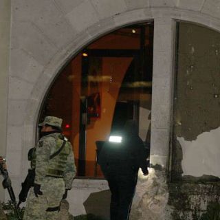 COAHUILA (12/JUL/2011).- Elementos del ejército tienen acordonado el edificio del comité directivo estatal del PRI en el boulevard Francisco Coss, en Saltillo Coahuila, donde cerca de la media noche se cometió un atentado con uno o varios artefactos explosivos.