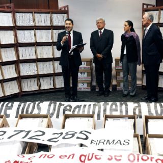 López Obrador y Martí Batres acudieron al salón donde se entregarían las firmas, pero en lugar de colocarse donde se encontraban los integrantes de mesa directiva, se ubicaron del lado derecho junto a las 137 cajas con las firmas de los ciudadanos y comenzó a dar un mensaje.