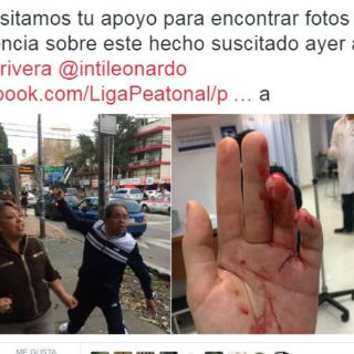 Después de ser atendida, la víctima difundió su mensaje con fotografías del agresor y la herida. La cuenta de Facebook y Twitter de Liga Peatonal solicitan ayuda para localizar al agresor.